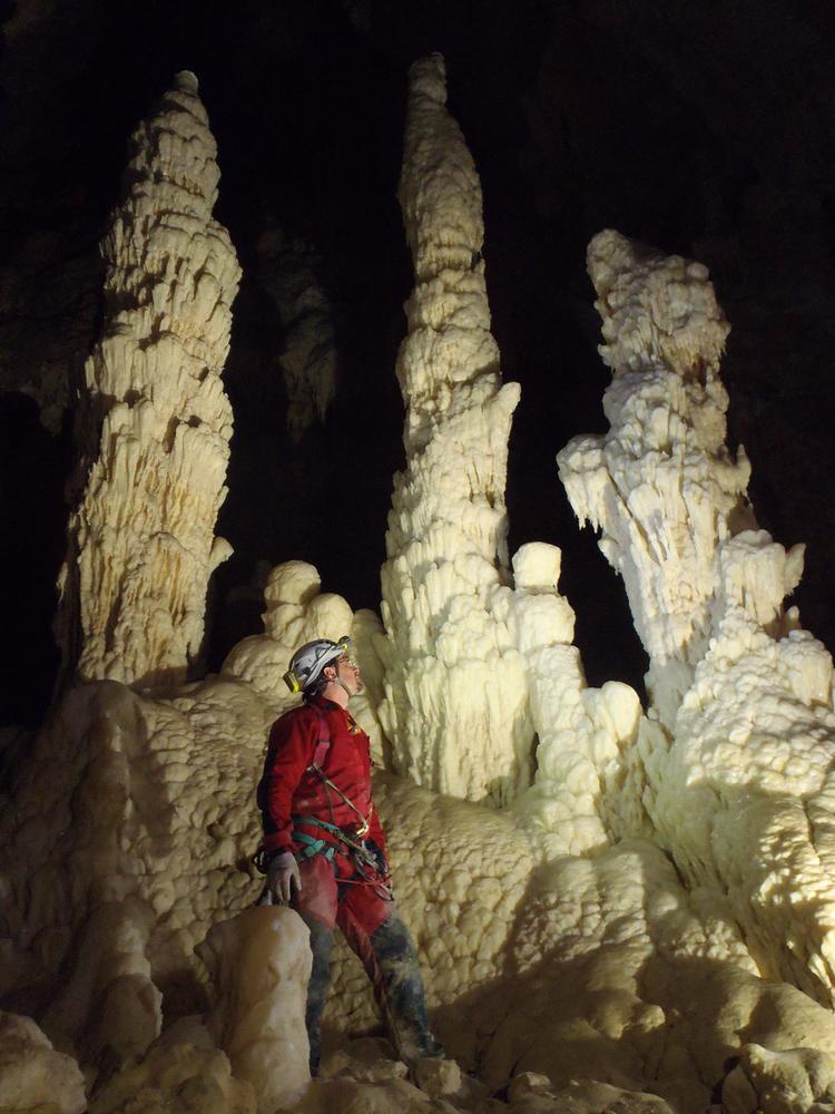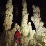 Un festone continuo di concrezioni bianchissime (per i nostri standard) ci accompagna ovunque si posi la vista. In un labirinto, per noi, non conoscendo la struttura, che affrontiamo con continuo stupore. Stalattiti enormi, stalagmiti a festoni elaboratissime, eccentriche stranissime, ovunque, “colate” maestose di calcare, piccoli anfratti che sembrano presepi delicati. A volte viene l’impressione di essere intrusi. Purtroppo i mille passaggi di centinaia speleo si vedono (sigh) e noi si cerca di essere meno intrusi possibile. A un certo punto, come ha detto Alberto, bisogna chiudere gli occhi per procedere, altrimenti non ti muoveresti più da lì. Non avrei idea di come descrivere meglio l’ambiente. Inutile perdersi in dettagli che non si riuscirebbe a descrivere pienamente.