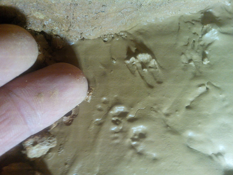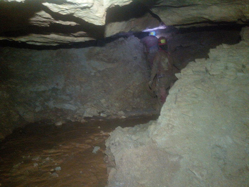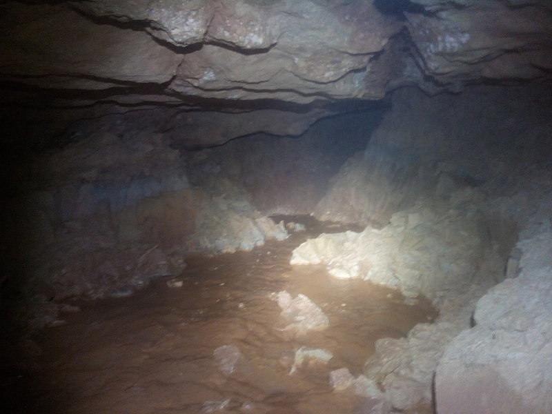 L'entusiasmo è giustificato dalla bellezza della nuova galleria trovata, un “argillone” con il pavimento concrezionato ed acqua. Si cammina in piedi ed è largo circa 4 metri. In un'ansa laterale si è accumulato del fango sopra cui sono evidenti tracce di animali di almeno due specie, indicativamente qualcosa delle dimensioni di un topo e qualcosa di più grande (faina?). Con il telefono fotografo e filmo per quanto possibile.